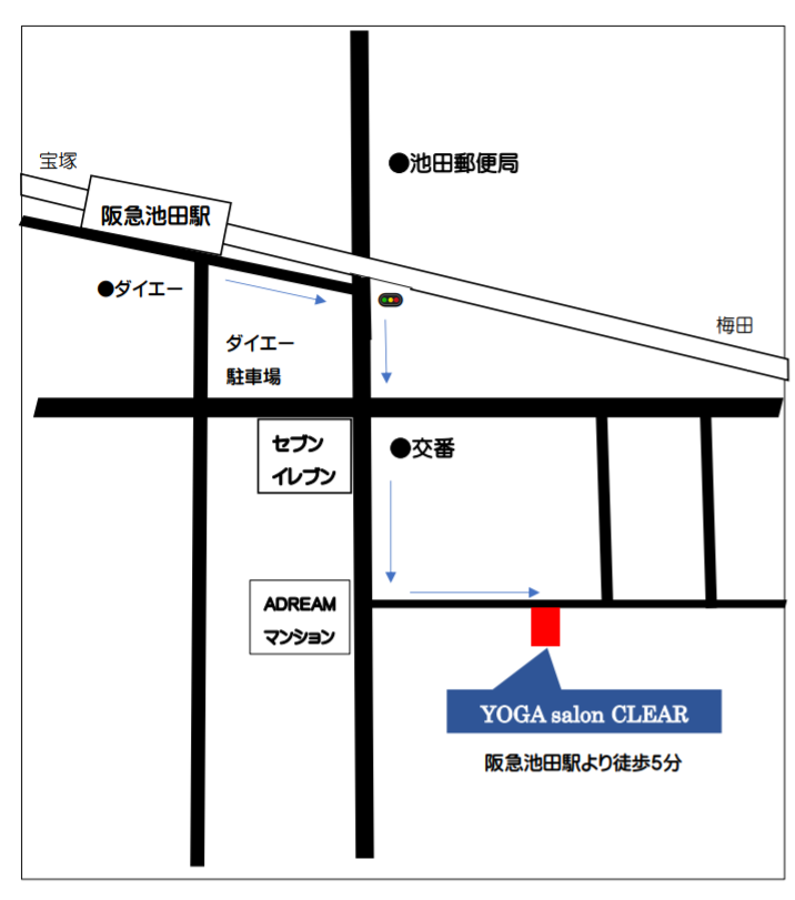 ヨガ サロン クリア 【住所】563-0041 大阪府池田市満寿美町6-4 【TEL】090-8572-5788 阪急宝塚線 池田駅より徒歩6分 ※自転車・バイクの駐輪場あります ※駐車場はありませんので近隣のコインパーキングをご利用ください ご予約・お問合せはこちらをクリック 阪急池田駅から徒歩6分ほどです。満寿美町交番とセブンイレブンの間の道を南に進み左側に細い路地があります。路地を進むと一軒家が並びその7軒目がヨガサロンクリアです。